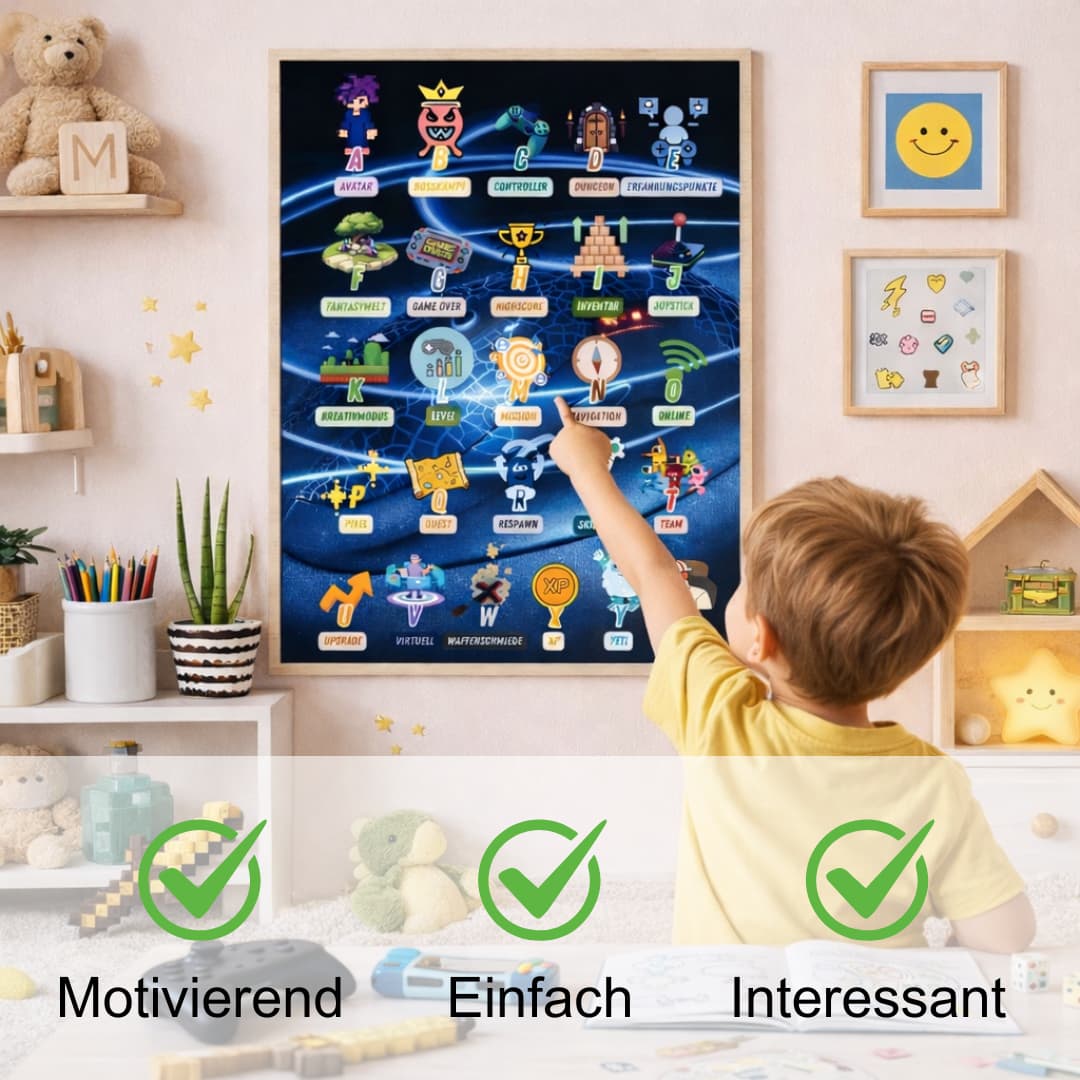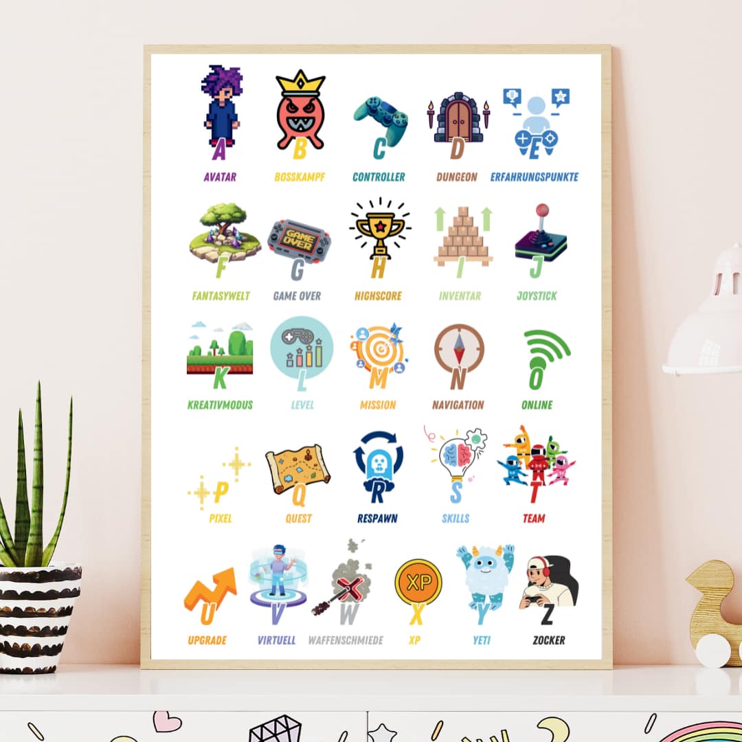 Durch das Design im Gaming Stil, sowie die dazugehörigen Gaming-Begriffe, bleiben die Inhalte besonders interessant. Ideal für Kinder, die sonst nicht besonders viel Lust zu lernen haben, dafür aber umso mehr Interesse an der Konsole haben. Mit diesem Lernposter lernen die kleinen Zocker ohne Druck ganz leicht im Alltag.